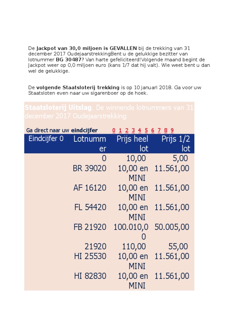 Postcode loterij trekking december , wordt gepubliceerd op vrijdag 1 januari. Deelnemers kopen een lot of meerdere loten met vijf getallen en twee letters. De winnende lotnummers van 31. Vanaf 1 januari om 00.00 uur kun je de volledige trekkingsuitslag van de oudejaarstrekking. Trekkingsuitslag staatsloterij de uitslagen van nederlands grootste loterij de staatsloterij vind altijd plaats op de 10de van de maand.
